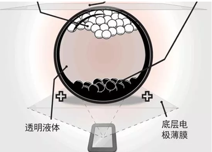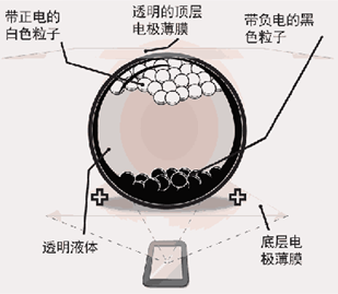 電子墨水的主要由大量細(xì)小微膠囊組成,這些微膠囊約為人類頭發(fā)直徑大小。每個(gè)微膠囊中包含懸浮于澄清液體之中的帶正電荷的白粒子和帶負(fù)電荷的黑粒子。設(shè)置電場(chǎng)為正時(shí),白粒子向微膠囊頂部移動(dòng),因而呈現(xiàn)白色。同時(shí),黑粒子被拉到微膠囊底部,從而隱藏。如施加相反的電場(chǎng),黑粒子在膠囊頂部出現(xiàn),因而呈現(xiàn)黑色。